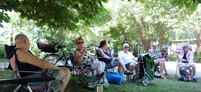 Här sitter vi under den stora kastanjen i skuggan. En svag bris svalkar